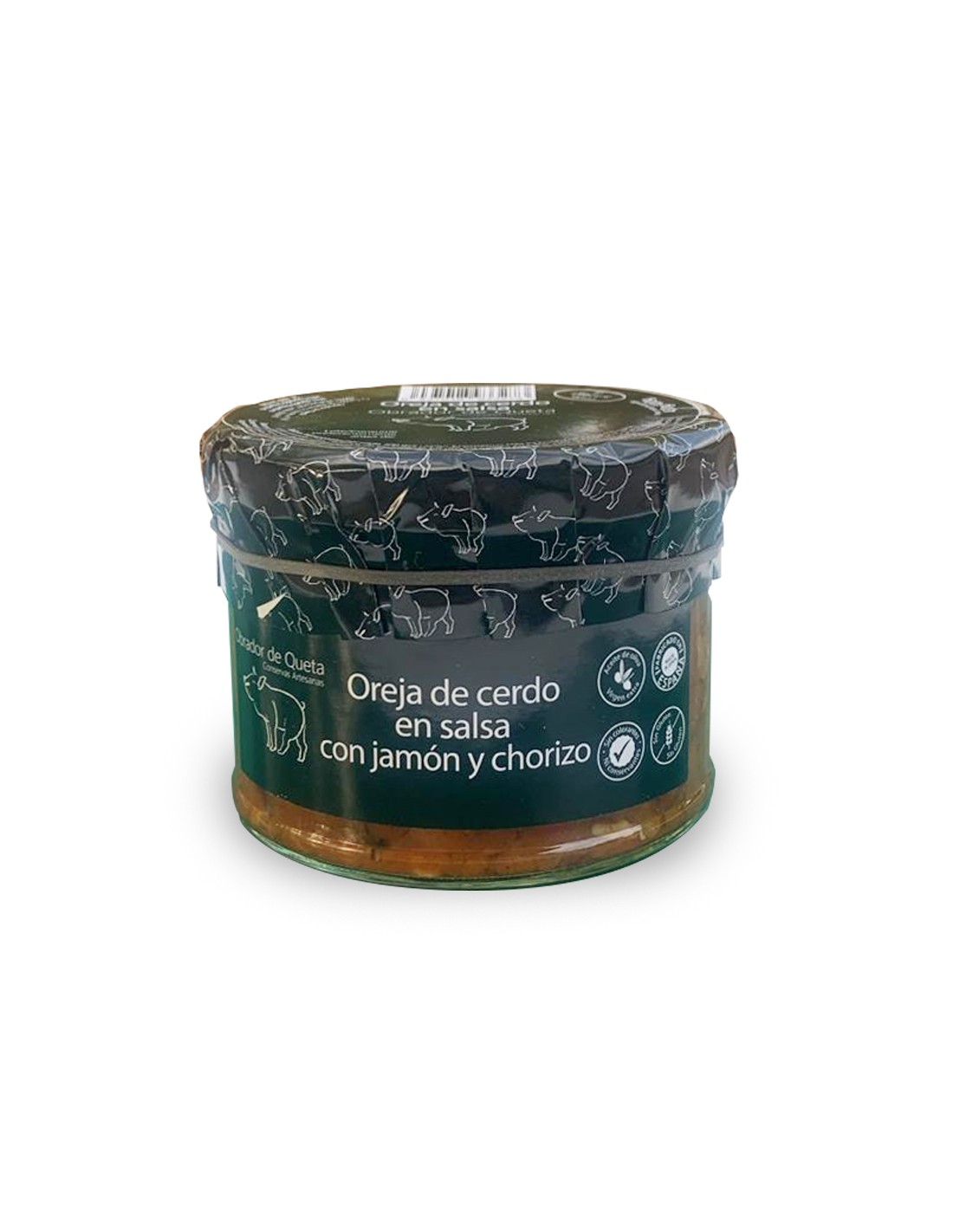 INGREDIENTES: Oreja de cerdo, cebolla, pimiento verde, pimiento rojo, tomate, puerro, vino blanco, chorizo (magro de cerdo, panceta, pimentón, sal y ajo), jamón curado (jamón de cerdo y sal), aceite de oliva Virgen Extra, pimentón, ajo, sal y especias.