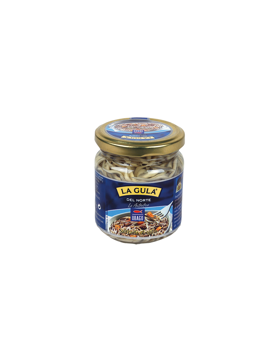 Producto de la pesca transformado (50%) (proteína de pescado, agua, aceite de girasol, harina de trigo, sal, proteína de soja, proteína vegetal, proteínas de la leche, albúmina de huevo, aromas (pescado, moluscos, trigo, cebada), potenciador del sabor (glutamato de monosodio), estabilizante (goma xantana), corrector de acidez (ácido láctico), tinta de cefalópodo (molusco)), aceite de girasol, aroma de ajo (0,5%) y guindilla (0,3%). Puede contener crustáceos.