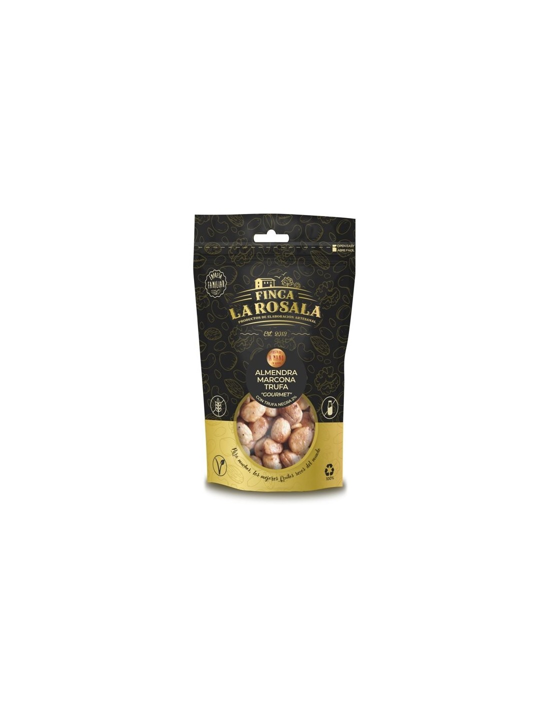 Marcona sin piel tostada a mano y elaborada con una mixtura especial de azúcar de caña integral, trufa sólida (Tuber Aestivum) y aroma de trufa natural.