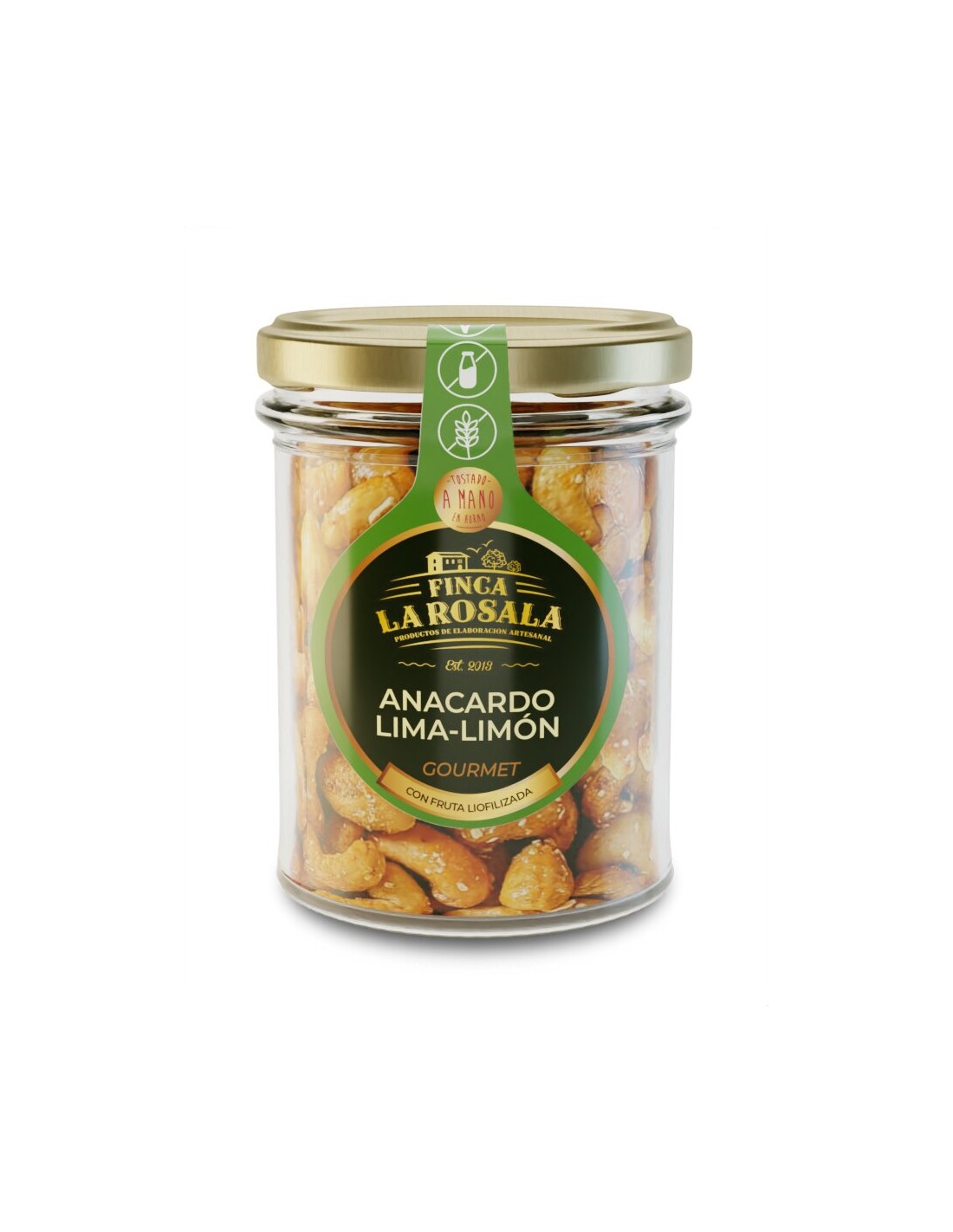 Anacardo tostado a mano con una mixtura especial de azúcar de caña integral, limón y lima ecológicos liofilizados y aroma natural de lima y limón. Combinación exótica y deliciosa.