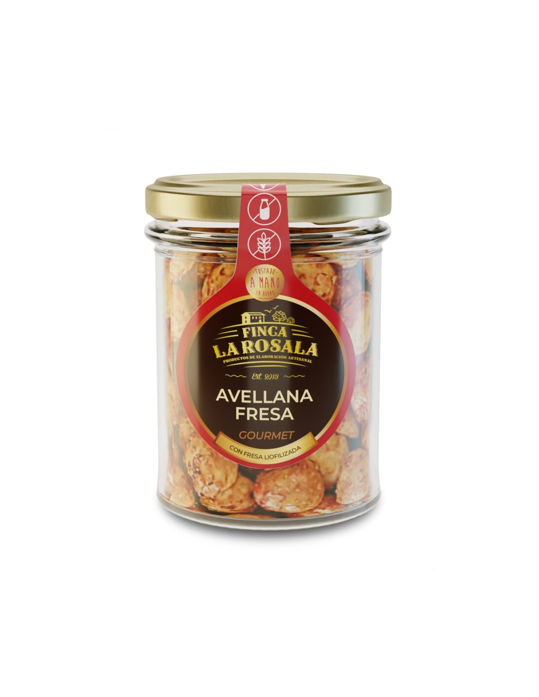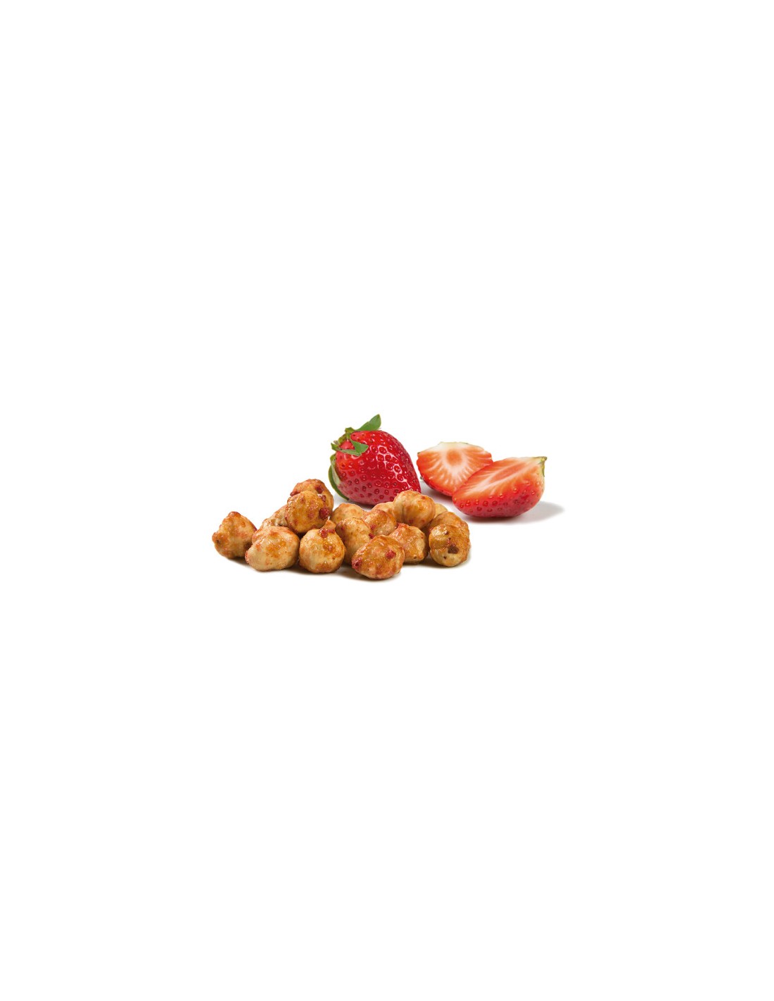 Avellana sin piel tostada a mano con azúcar de caña integral y aroma natural de fresa.