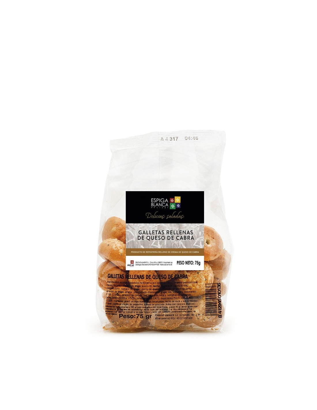 Aceites vegetales e hidrogenados, huevo entero pasteurizado, harina de arroz, harina de trigo, suero de leche en polvo, queso de cabra, sorbitol de trigo, crema de queso en polvo, almidón de arroz, almidón de trigo, aromas, pan rallado (harina de trigo, sal, levadura, colorantes, almidón de patata, sal, pimienta negra, semillas de amapola, gasificantes, emulsionantes, espesantes, estabilizantes y colorantes.