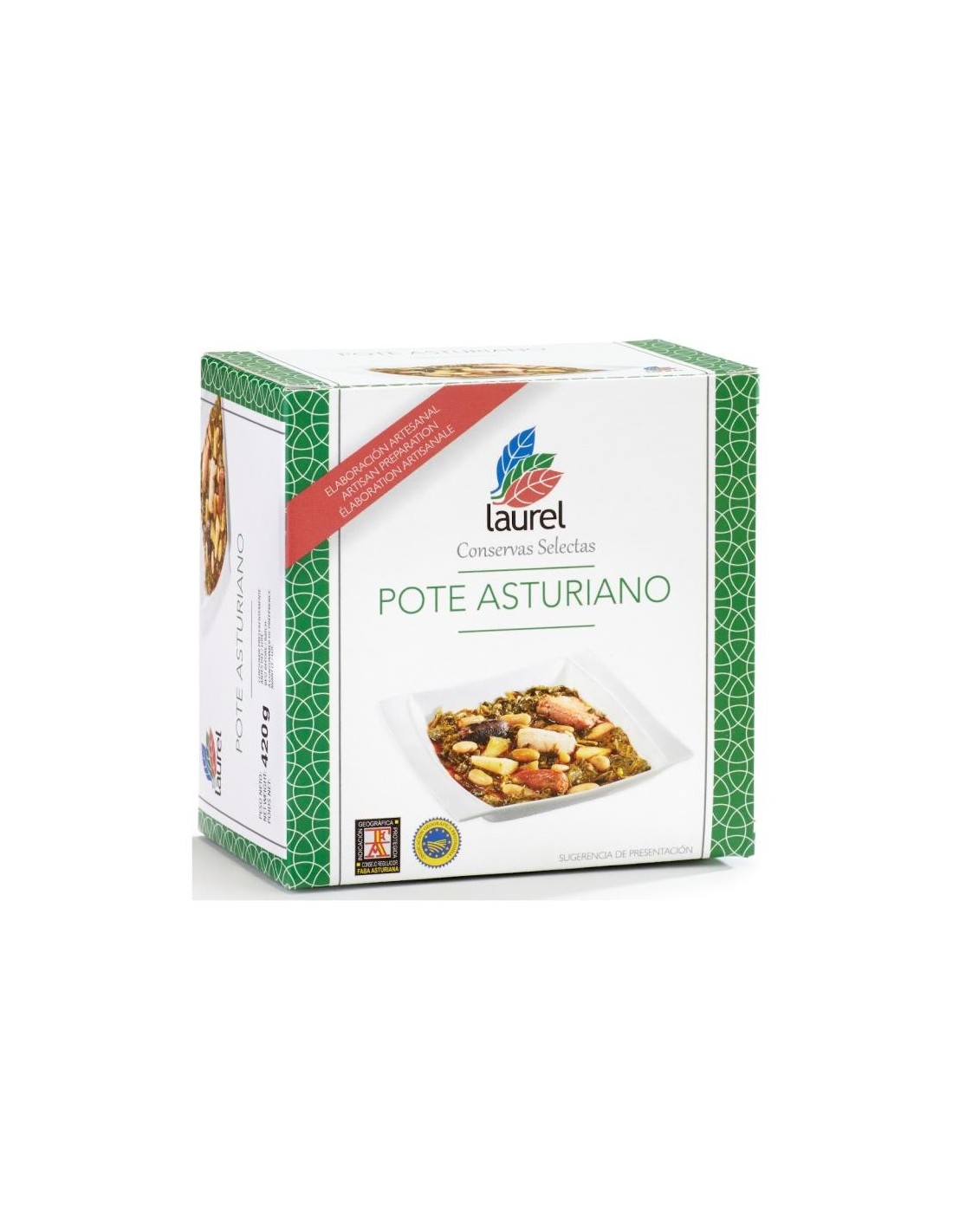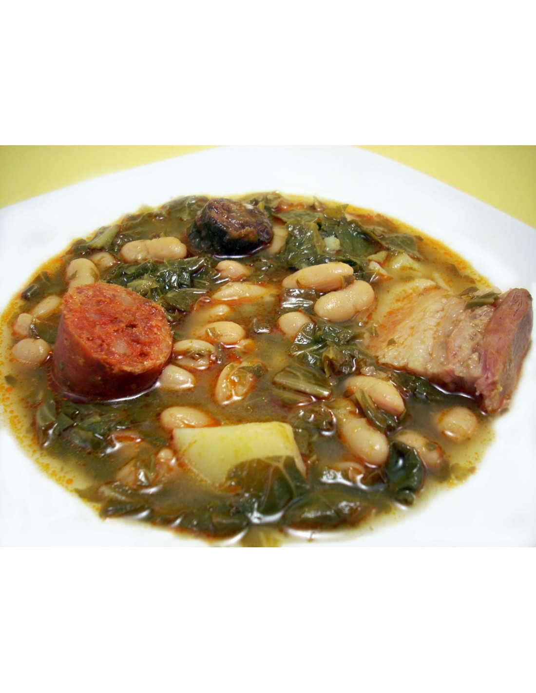 Caldo de cocción, berza (18%), patata, chorizo (magro de cerdo, papada de cerdo, pimentón, sal, ajo)(8%), morcilla (tocino de cerdo, cebolla, manteca, sangre, pimentón, especias)(8%), tocino ibérico(8%), costilla de cerdo (8%), alubia tipo granja (Phaseolus vulgaris), aceite de oliva, ajo, pimentón, sal marina y azafrán.