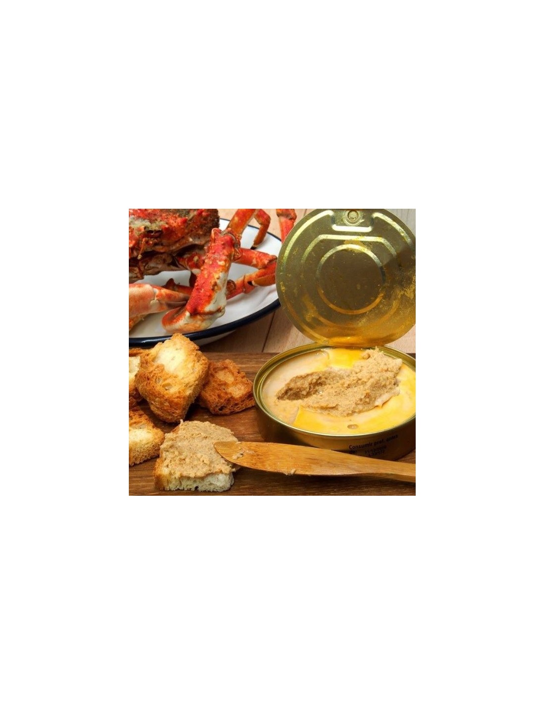 Clara de huevo líquido, centollo (crustaceo)(29%), nata líquida, merluza (pescado), tomate, aceite de oliva, vino Pedro Ximenez, sal marina y especias.